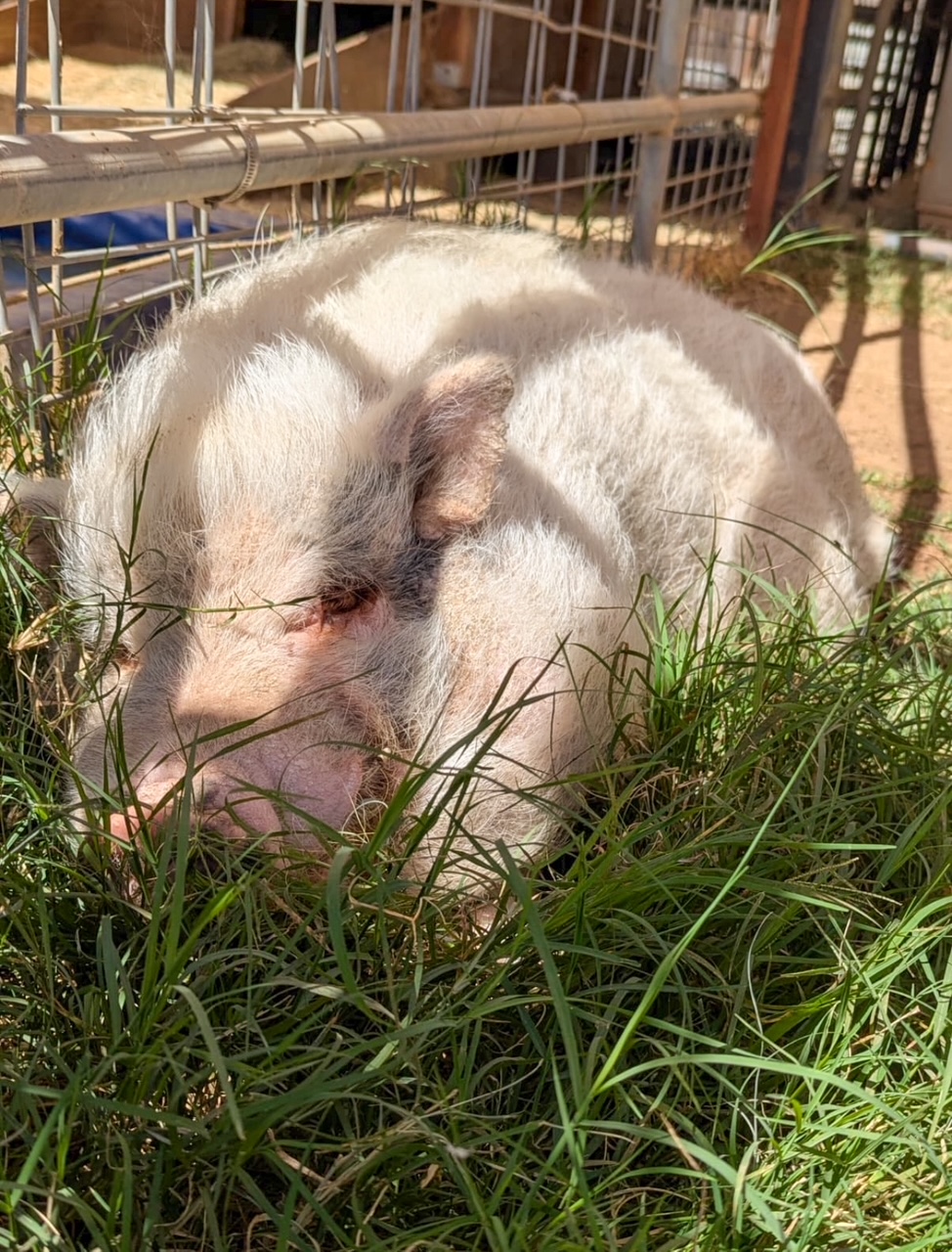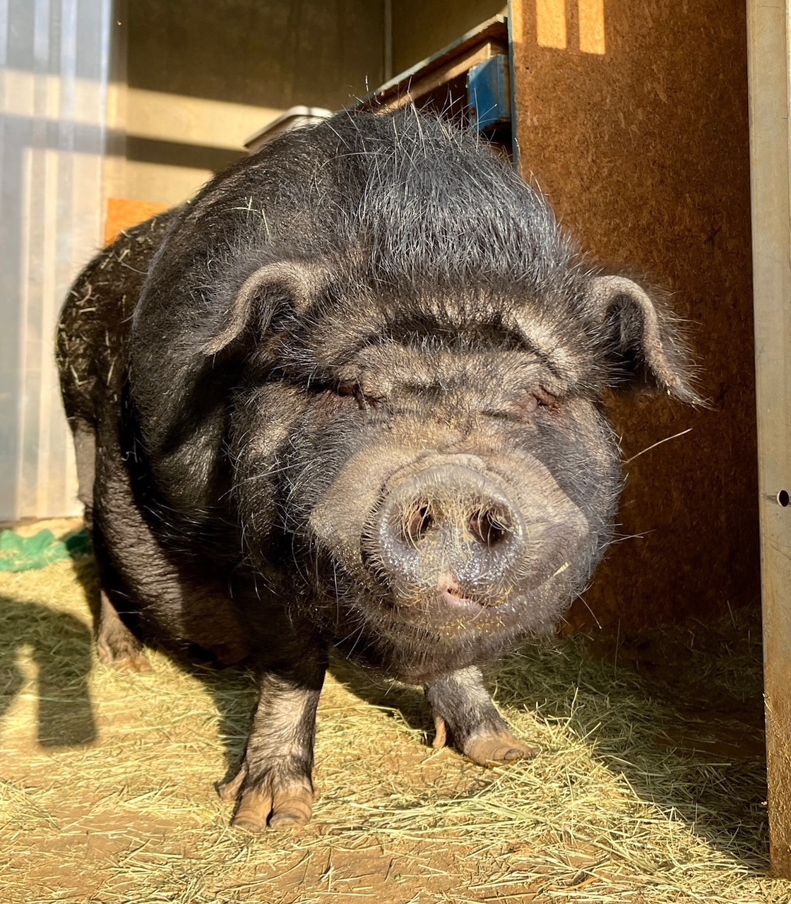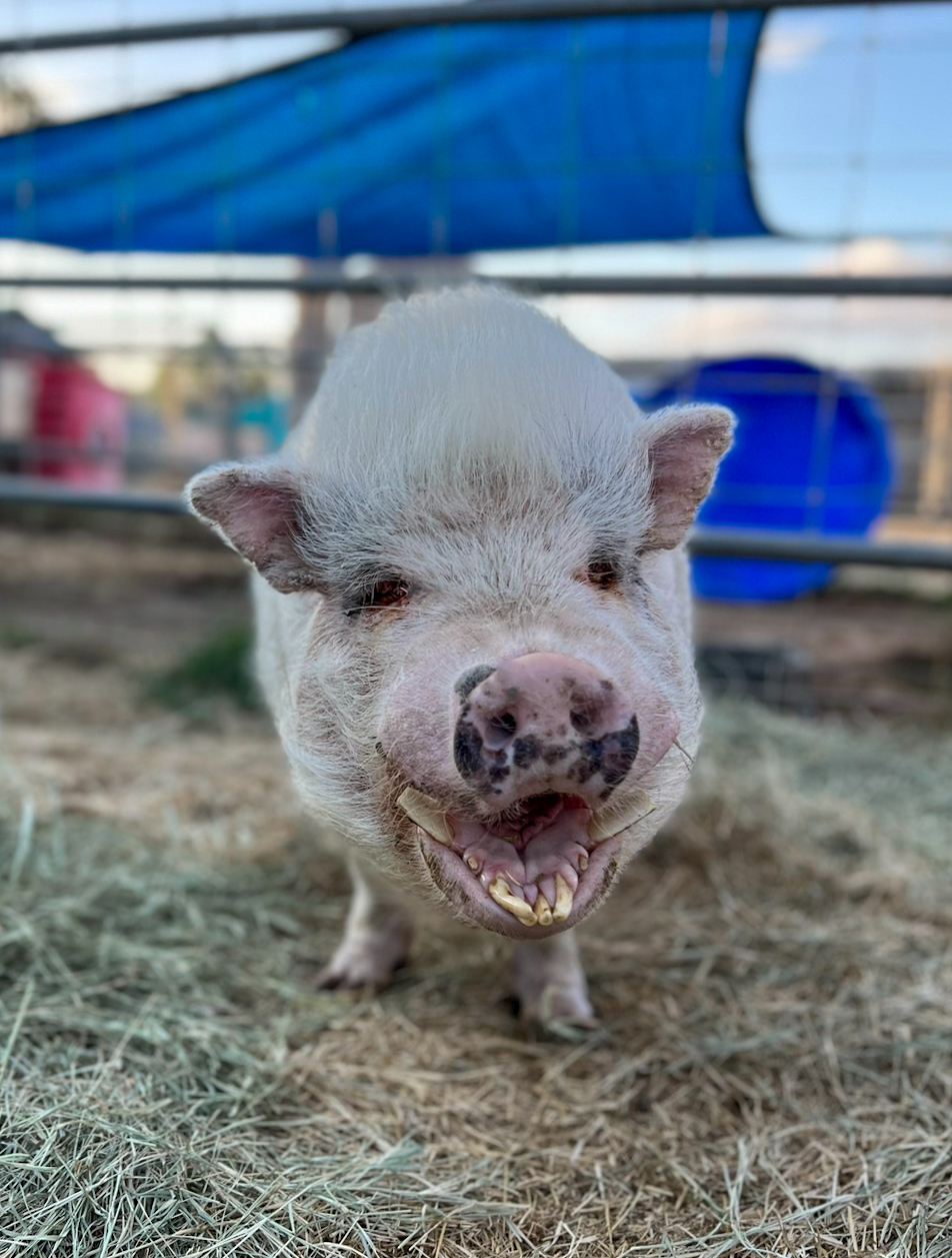 Harry Smiles came to Saving Animals & Healing Hearts already a senior back in 2021. Landing here by accident through a case of mistaken identity. We were working with another sanctuary and pulled a pig from a high-kill shelter that was to stay with us temporarily. However, to our surprise, when the pig arrived, it was a completely different pig! There was absolutely no way we were sending him back to the shelter, so Mr. Harry Smiles has been here ever since. What a happy accident it was for him and for us.